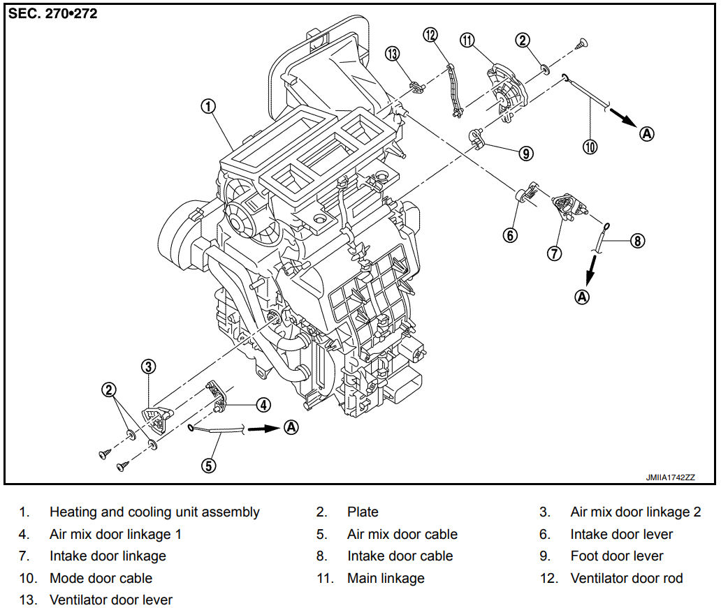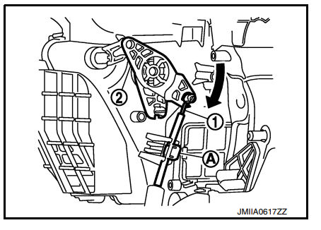 - Push intake door link (2) in the direction shown, then carefully pull outer cable to front air control side and connect clip.